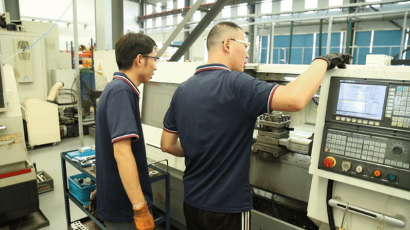 但也不是每一步都很順利,當他遇到刀具發出一聲異響以后,(這聲音小編是一點兒沒有分辨出)立刻關停機器,小跑著找到自己的師傅。他直接說明了問題后,正在調機的師傅立馬來到他的機器前,耐心地幫他找出問題原因,并且教他如何處理,通過重新調試刀具,快速地解決了問題,小楊也露出了笑容。