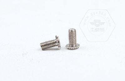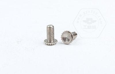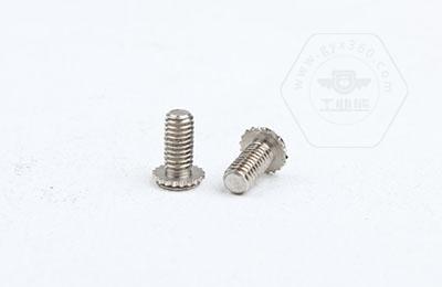 在使用過程中需在基體上開一個小孔,將壓鉚螺釘放入孔內,采用鉚壓設備平行的均勻的在頭部平壓,因壓鉚螺釘的頭部下有齒紋壓花,當壓入后,基體在壓鉚螺釘的周圍產生變形,和齒紋發生咬合現象,從而形成一個牢固的外螺紋。