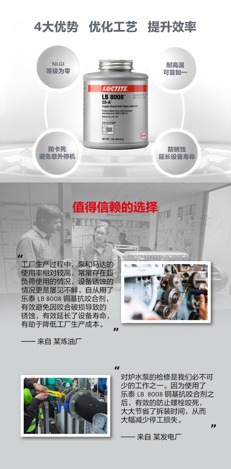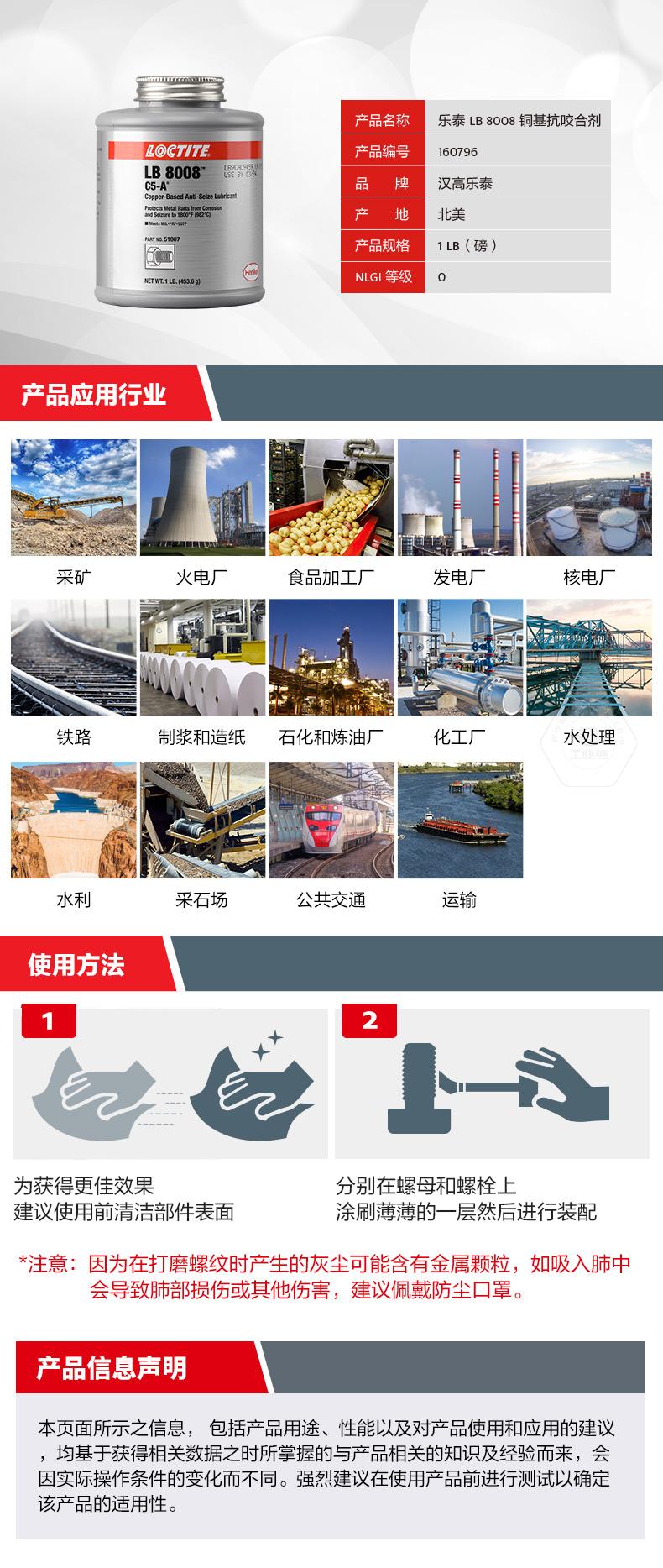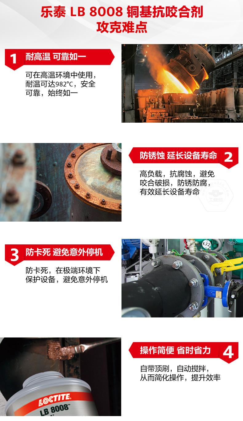 樂泰LB8008銅基抗咬合劑是一款通用型耐高溫抗咬合劑。樂泰LB8008銅基抗咬合劑耐溫可達982℃,具備防銹蝕、防卡死、NLGI等級為0等特點。樂泰LB8008銅基抗咬合劑適用于高負載和極端環境,可幫助避免咬合破損、延長設備壽命、減少意外停機。樂泰LB8008銅基抗咬合劑自帶頂刷并可自動攪拌,操作更簡便,適用于采礦、發電、石化、鐵路、水處理等行業。