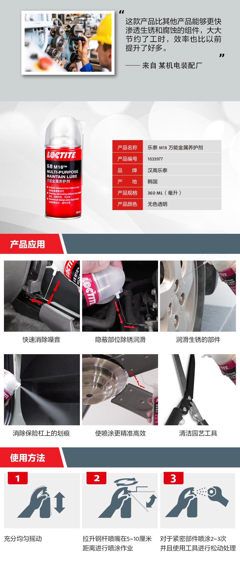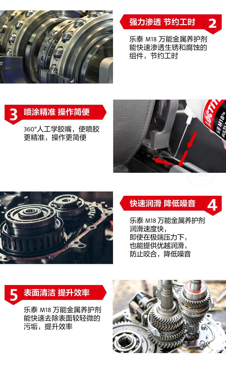 樂泰M18萬能金屬養(yǎng)護(hù)劑是一款集防銹、滲透、潤滑、清潔于一體的產(chǎn)品。樂泰M18萬能金屬養(yǎng)護(hù)劑由于低表面張力,能夠在水分和金屬表面之間形成保護(hù)屏障,實(shí)現(xiàn)長期防銹。樂泰M18萬能金屬養(yǎng)護(hù)劑可快速滲透生銹和腐蝕組件,節(jié)約工時(shí)。樂泰M18萬能金屬養(yǎng)護(hù)劑采用360°人工學(xué)膠嘴,噴涂更精準(zhǔn),操作更簡便,還可快速潤滑并降低噪音,同時(shí)去除表面較輕微污垢,提升效率。
