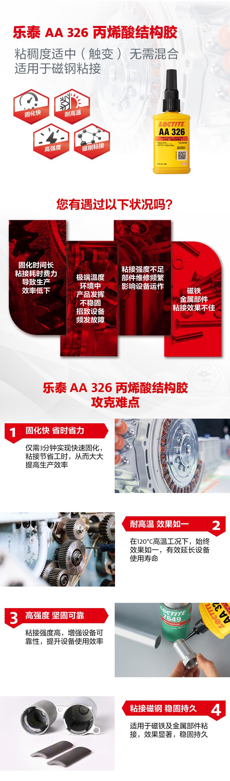 樂泰AA326丙烯酸結構膠粘稠度適中(觸變),無需混合,適用于磁鋼及金屬部件粘接。樂泰AA326丙烯酸結構膠僅需3分鐘即可快速固化,節省工時。樂泰AA326丙烯酸結構膠在120℃高溫工況下效果如一,且具備高強度特點。樂泰AA326丙烯酸結構膠主要用于將鐵氧體粘接到要求快速固定的電機定子或轉子上,也可用于揚聲器零件和珠寶。