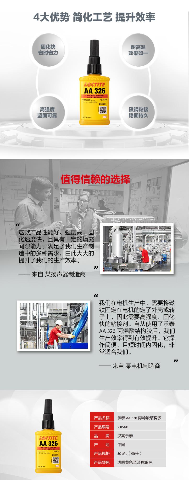 • 產品描述:樂泰AA 326是一款無需混合、中粘度的觸變型結構粘合劑,呈黃色至琥珀色,適合磁鋼粘接,電機、揚聲器硬件和珠寶中的鐵氧體/電鍍材料。針對不同類型的鐵氧體具有良好的粘接力,固化僅需3分鐘,剪切強度為2200 psi,最高耐受溫度為120°C。需搭配樂泰SF 7649 促進劑使用。